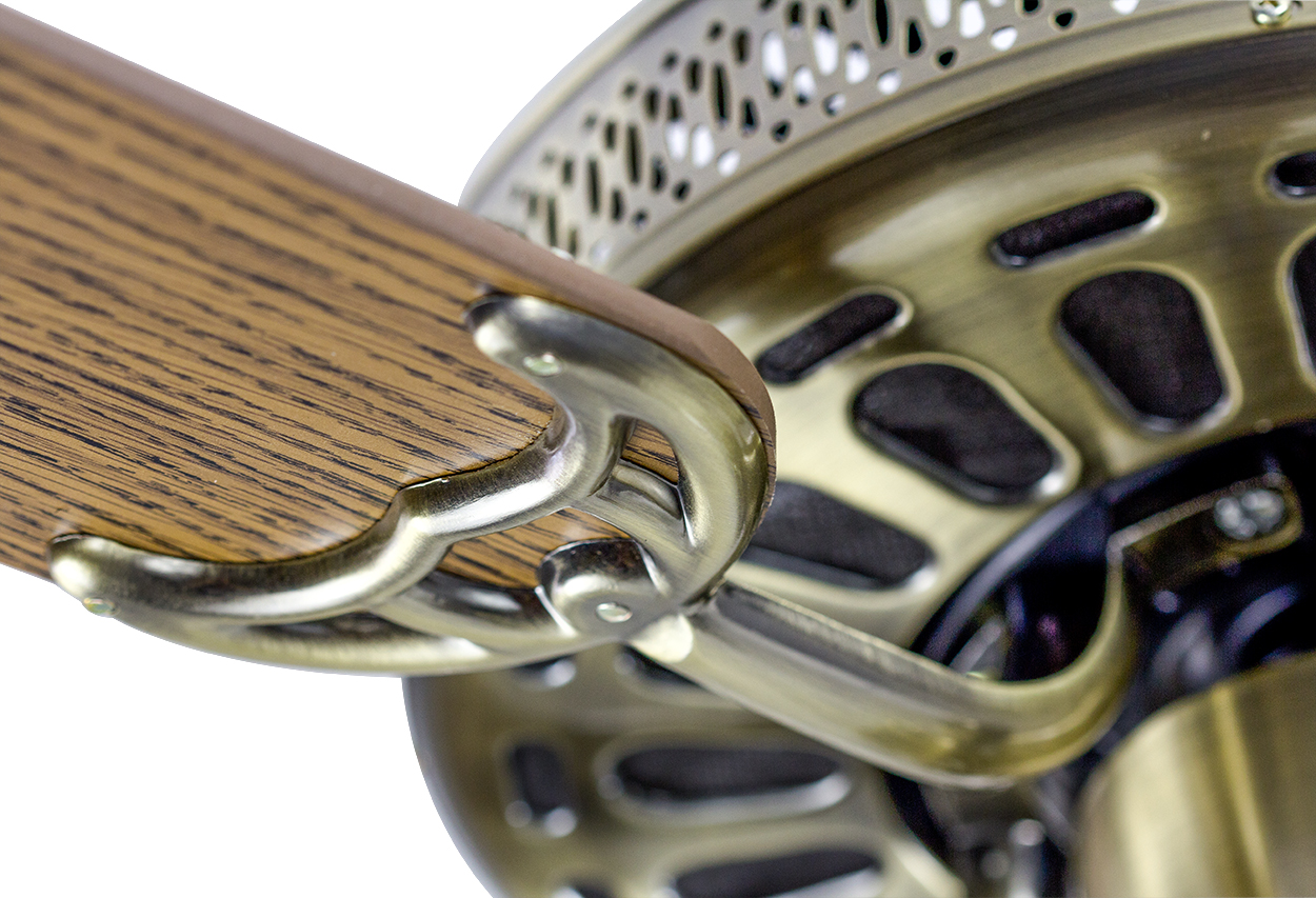 Лопасти вентилятора выполнены из клеёного влагостойкого МДФ, разного цвета с каждой стороны, т.е. пользователь может выбирать цвет из двух возможных. Оборотная сторона лопасти после установки будет направлена вверх к потолку, ее цвет не будет виден.