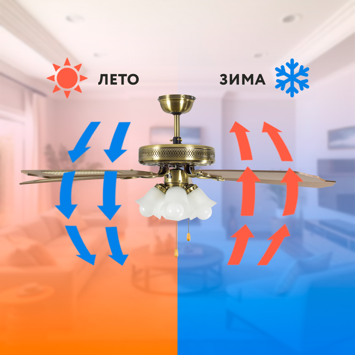 На корпусе устройства расположен ручной переключатель реверса мотора, которым пользователь может изменить направление вращения двигателя - с предустановленного «против часовой стрелки» на «по часовой». При таком изменении направления вращения создается эффект рекуперации тепла, позволяющий использовать вентилятор зимой для отведения в жилую зону накопившегося у потолка нагретого воздуха (что значительно сократит Ваши затраты на отопление зимой). Для эффекта охлаждения переключатель «реверса» перемещают в нижнее положение, для эффекта рекуперации тепла зимой - в верхнее положение.