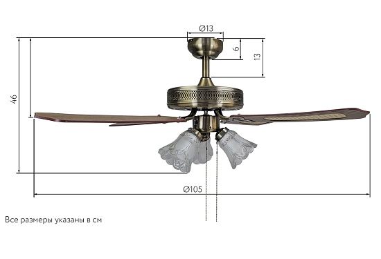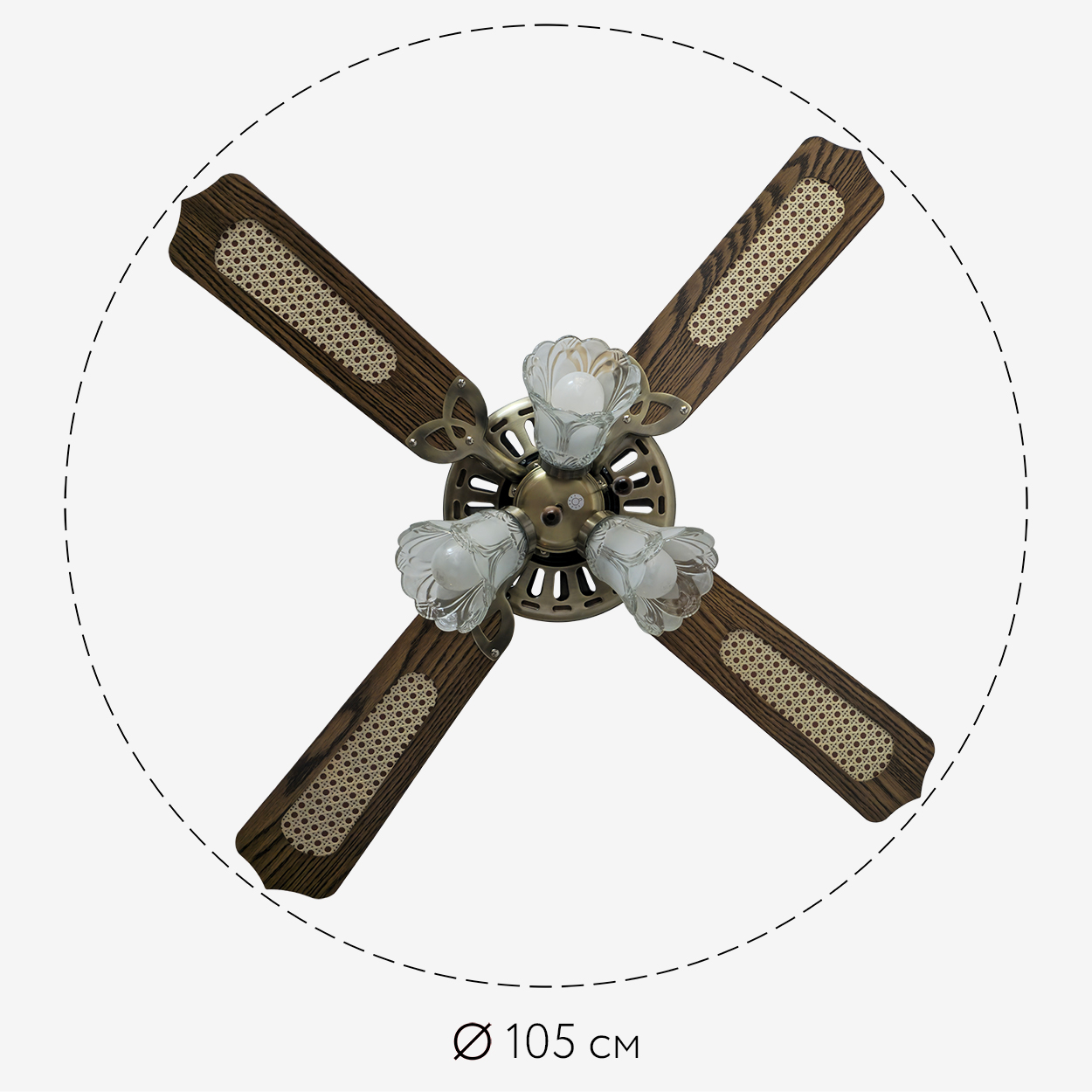 Размах лопастей - диаметр модели равен 105 см. Данная модель идеально подходит для эффективной работы в помещении площадью от 15-20 м2, с высотой потолка не более 4 м. Данная модель размером «L» в таблице применимости вентиляторов.