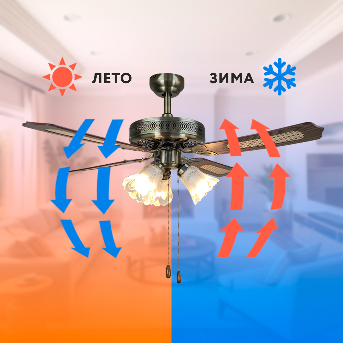 На корпусе устройства расположен ручной переключатель реверса мотора, которым пользователь может изменить направление вращения двигателя - с предустановленного «против часовой стрелки» на «по часовой». При таком изменении направления вращения создается эффект рекуперации тепла, позволяющий использовать вентилятор зимой для отведения в жилую зону накопившегося у потолка нагретого воздуха (что значительно сократит Ваши затраты на отопление зимой). Для эффекта охлаждения переключатель «реверса» перемещают в нижнее положение, для эффекта рекуперации тепла зимой - в верхнее положение.