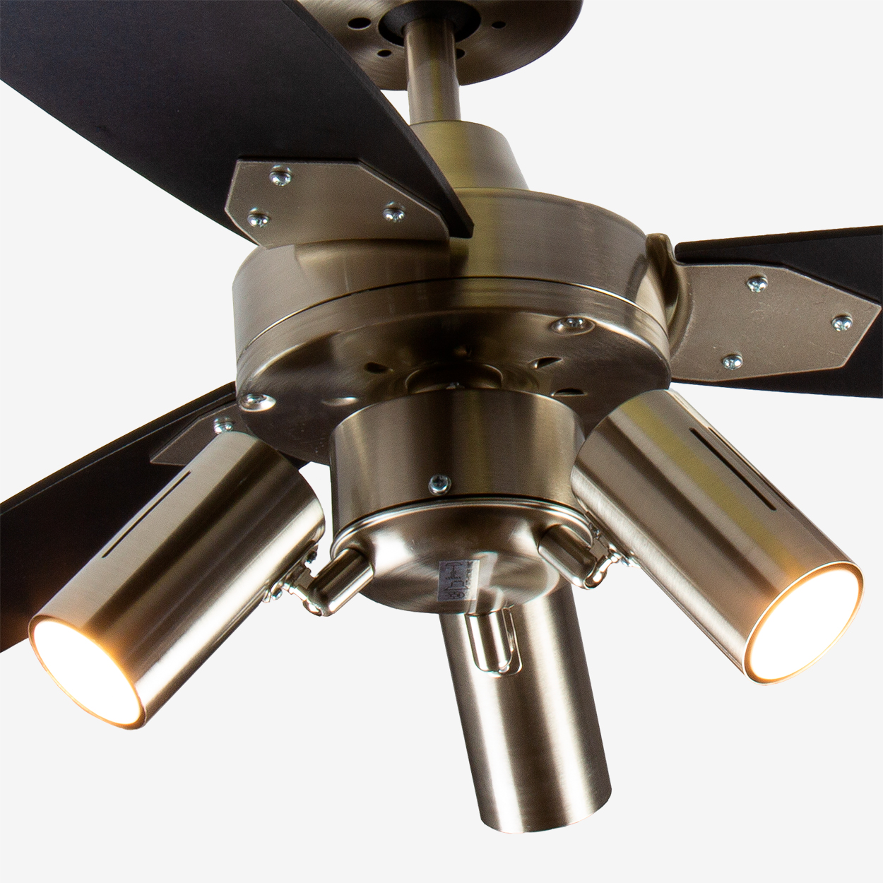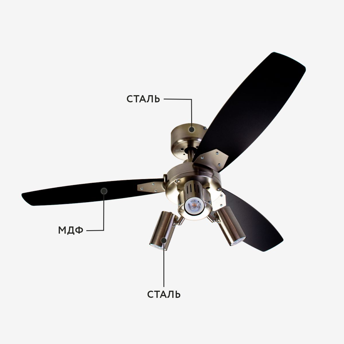 Лопасти вентилятора выполнены из клеёного влагостойкого МДФ, разного цвета с каждой стороны, т.е. пользователь может выбирать цвет из двух возможных. Оборотная сторона лопасти после установки будет направлена вверх к потолку, ее цвет не будет виден.