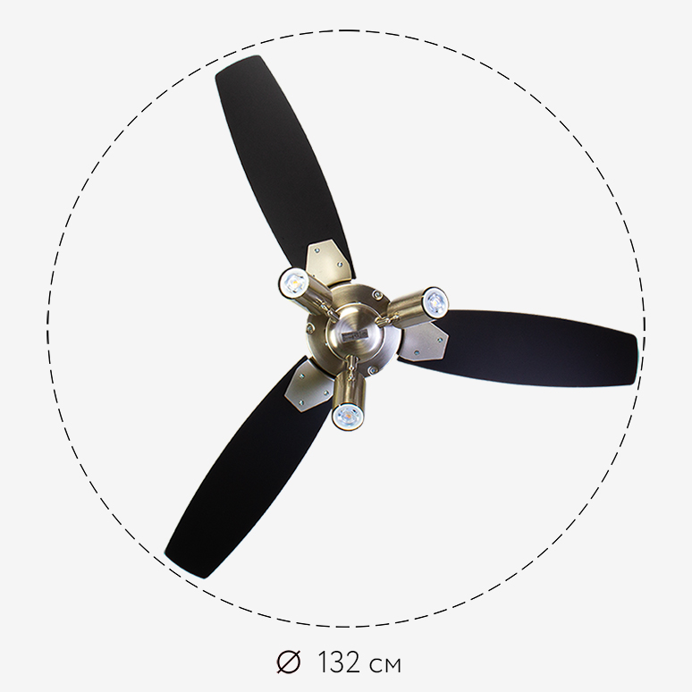Размах лопастей - диаметр модели равен 105 см. Данная модель идеально подходит для эффективной работы в помещении площадью от 15 до 20 м2, с высотой потолка не более 4 м. Данная модель размером «L» в таблице применимости вентиляторов.