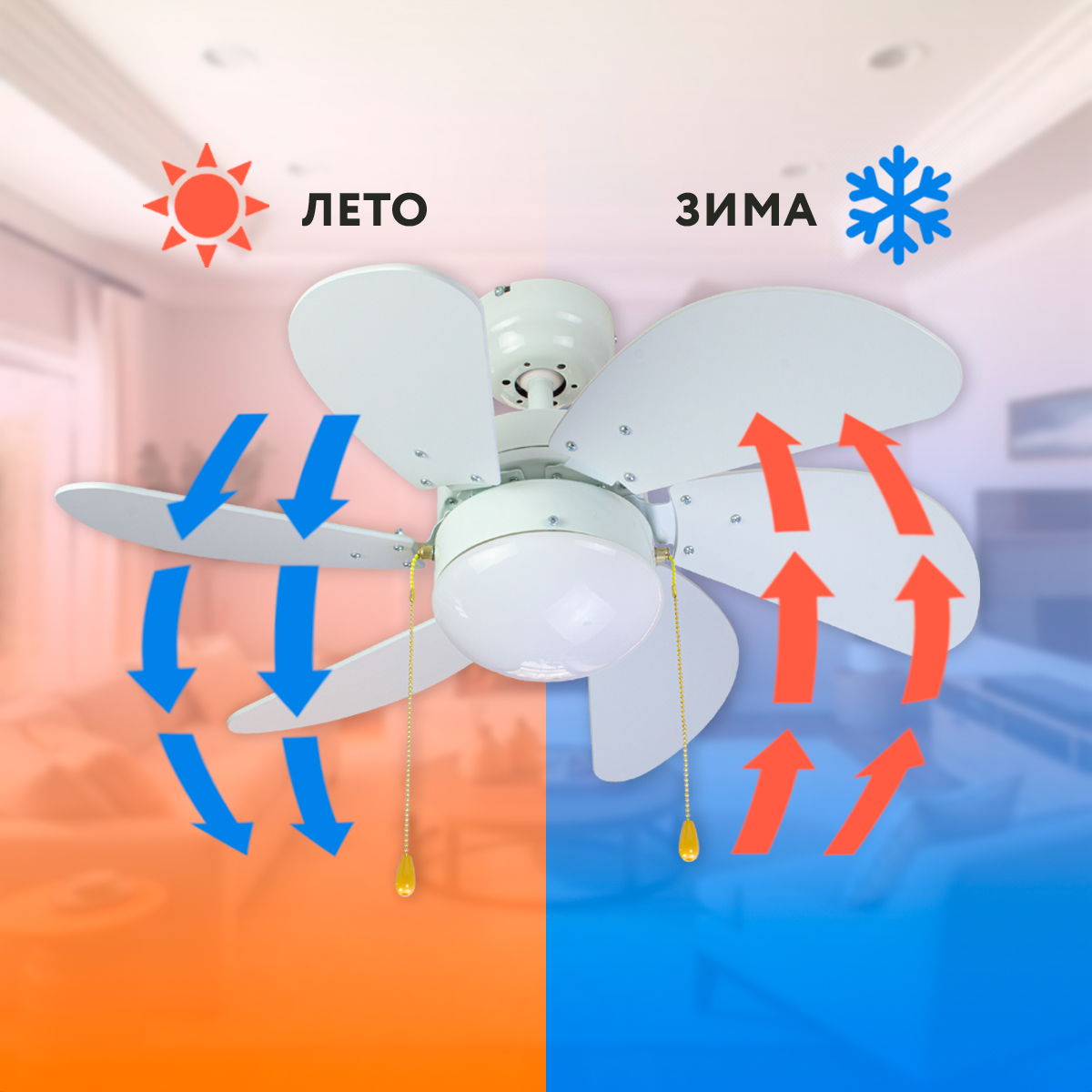 На корпусе устройства расположен ручной переключатель реверса мотора, которым пользователь может изменить направление вращения двигателя - с предустановленного «против часовой стрелки» на «по часовой». При таком изменении направления вращения создается эффект рекуперации тепла, позволяющий использовать вентилятор зимой для отведения в жилую зону накопившегося у потолка нагретого воздуха (что значительно сократит Ваши затраты на отопление зимой). Для эффекта охлаждения переключатель «реверса» перемещают в нижнее положение, для эффекта рекуперации тепла зимой - в верхнее положение.