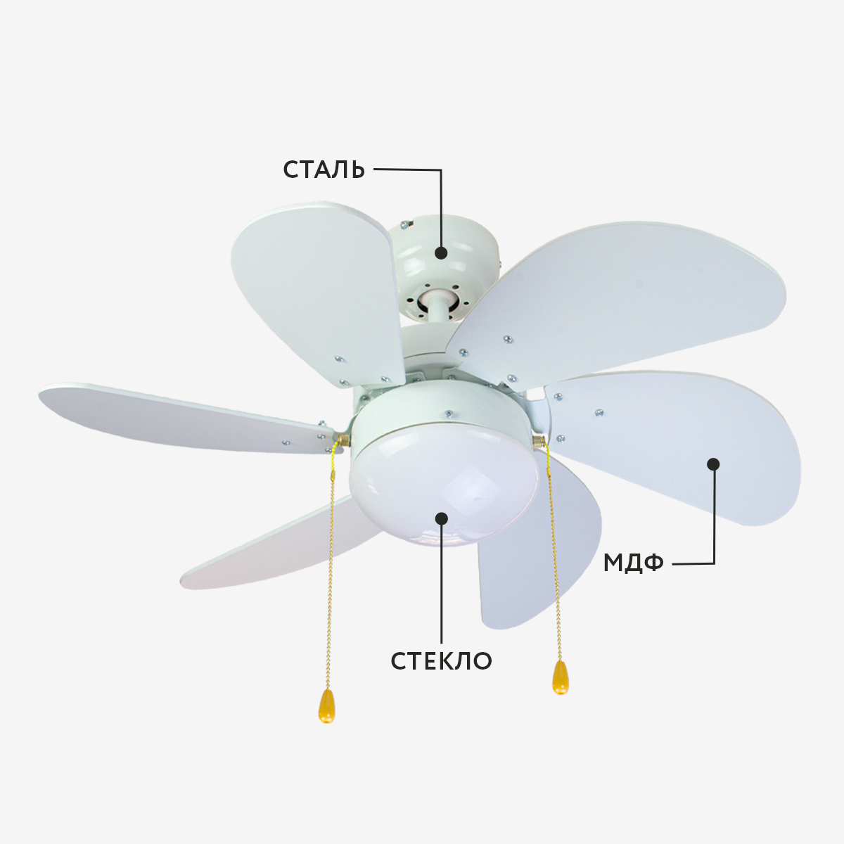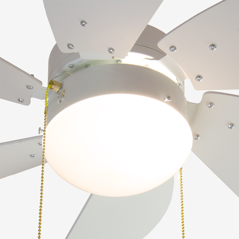 Лопасти вентилятора выполнены из клеёного влагостойкого МДФ, разного цвета с каждой стороны, т.е. пользователь может выбирать цвет из двух возможных. Оборотная сторона лопасти после установки будет направлена вверх к потолку, ее цвет не будет виден.