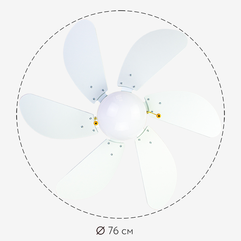 Размах лопастей - диаметр модели равен 76 см. Люстра вентилятор идеально подходит для эффективной работы в помещении площадью до 10 м2, с высотой потолка не более 4 м. Данная модель размером «L» в таблице применимости вентиляторов.