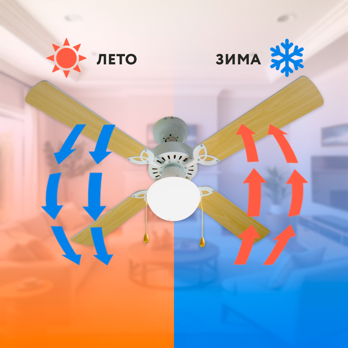 На корпусе устройства расположен ручной переключатель реверса мотора, которым пользователь может изменить направление вращения двигателя - с предустановленного «против часовой стрелки» на «по часовой». При таком изменении направления вращения создается эффект рекуперации тепла, позволяющий использовать вентилятор зимой для отведения в жилую зону накопившегося у потолка нагретого воздуха (что значительно сократит Ваши затраты на отопление зимой). Для эффекта охлаждения переключатель «реверса» перемещают в нижнее положение, для эффекта рекуперации тепла зимой - в верхнее положение.
