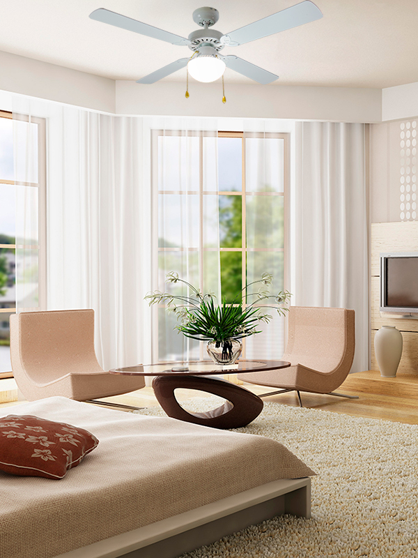 зимний период. Подходит для декоративного потолочного освещения.Управление устройством осуществляется при помощи радиопульта дистанционного управления Telefan, входящего в комплект поставки. С помощью радиопульта можно включать/выключать вентилятор мощностью до 100 Вт, выбирать одну из трех скоростей вращения лопастей, а также включать/выключать световую часть вентилятора общей мощностью до 300 Вт.