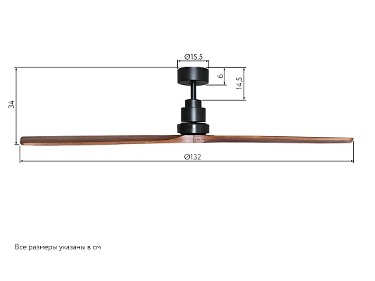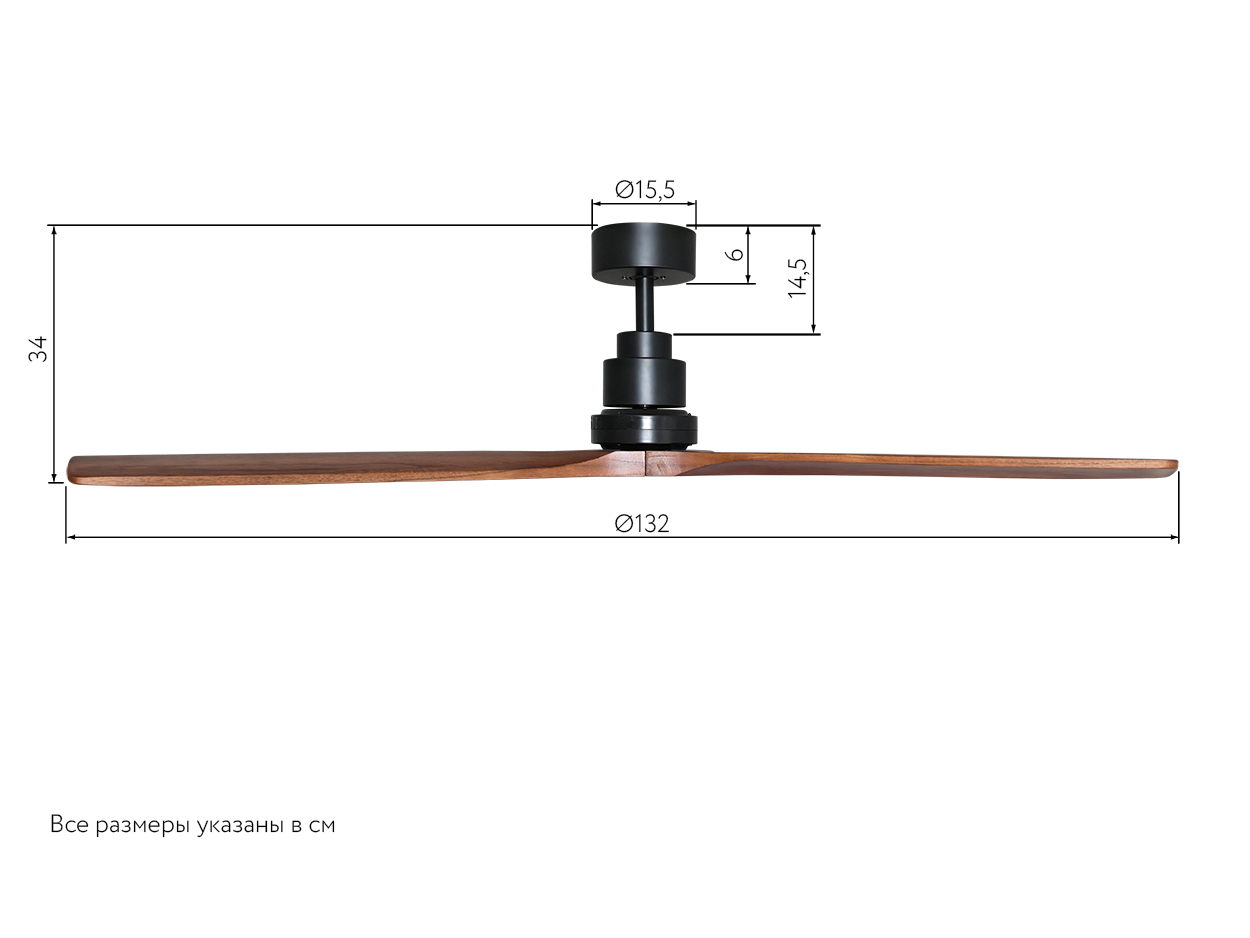 Размах лопастей (диаметр) модели равен 132 см. Лопасти изготовлены из натурального дерева. Цвет лопастей – грецкий орех.